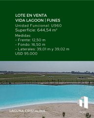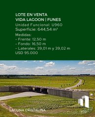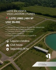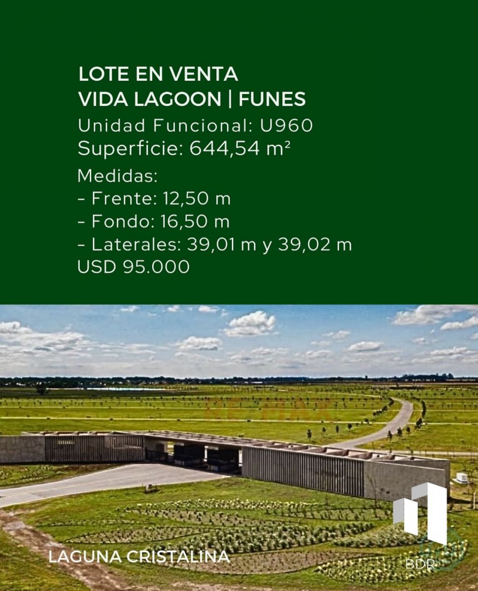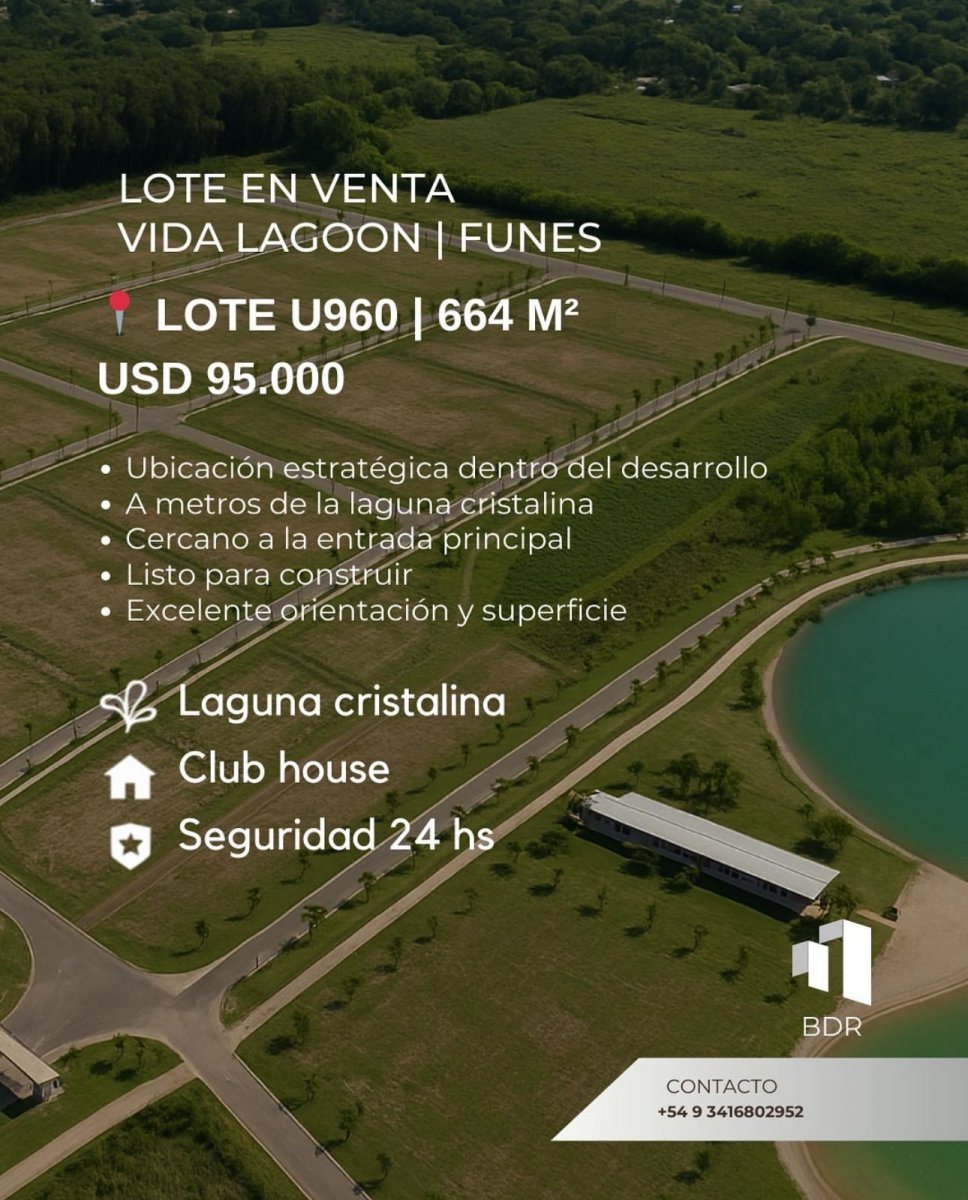 🏡📍LOTE EN VENTA – VIDA LAGOON | FUNES Unidad Funcional: U960 📐 Superficie: 644,54 m² 📏 Medidas: Frente: 12,50 m Fondo: 16,50 m Laterales: 39,01 m y 39,02 m 💲 Precio: USD 95.000 🌿 Viví rodeado de naturaleza, con la comodidad y seguridad de un barrio privado en pleno crecimiento: ✔️ Laguna cristalina ✔️ Club House ✔️ Seguridad 24 hs 📲 Contacto: +54 9 341 680 2952 BDR Inmobiliaria